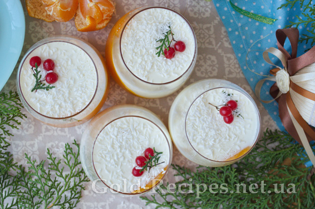 🍊 На той час, як біла частина охолоне, мандаринове желе вже буде готове, щоб продовжити готувати наш новорічний десерт. Розливаємо вершкову частину по стаканчиках і знову відправляємо в холодне місце мінімум на 2 години. Якщо потрібно швидко – скористайтеся морозильною камерою, я так і зробила.