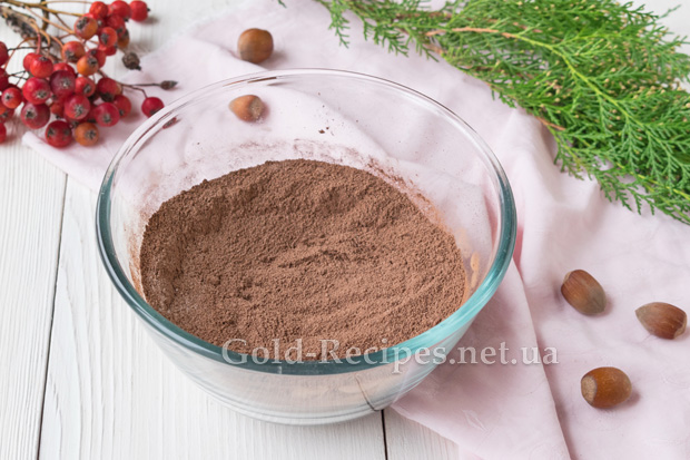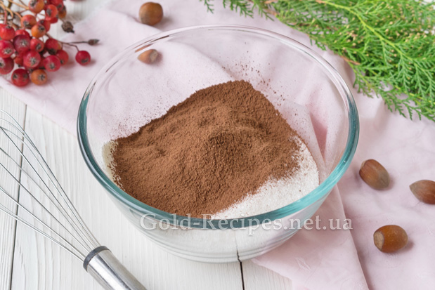 У глибокому посуді з’єднаємо цукровий пісок, просіяне пшеничне борошно та порошок какао.