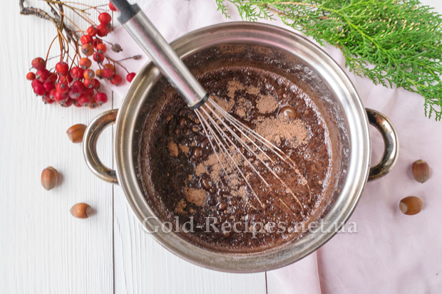 Потім, інтенсивно перемішуючи інгредієнти вінчиком, введемо в гаряче молоко суху цукрову суміш, щоб шоколадна паста вийшла однорідної консистенції.