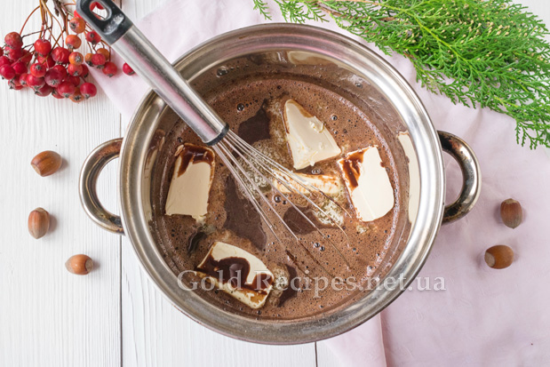Коли всі інгредієнти з’єднаються між собою в однорідну масу, додамо в неї шматочки вершкового масла. Повернемо каструлю з нутеллою на вогонь.
