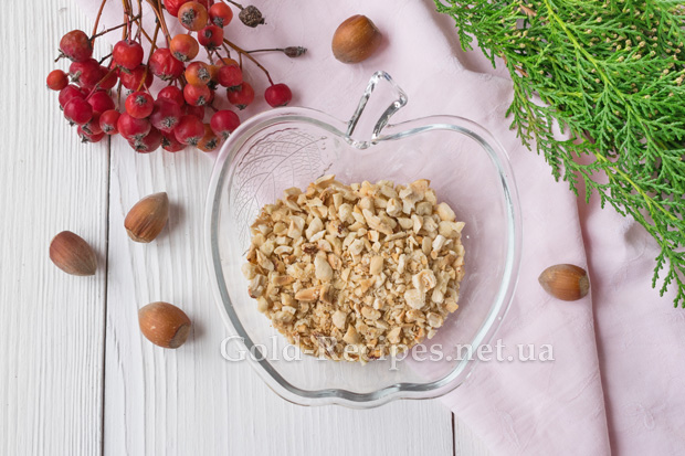 Фундук перекладемо на деко і відправимо в розігріту до 180 градусів духовку на 7 хвилин. Потім остудимо горіхи, очистимо від коричневої шкірки і подрібнимо в ступці або за допомогою блендера.