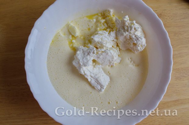У яєчно-цукрову суміш додаємо кисломолочний сир і вершкове масло.