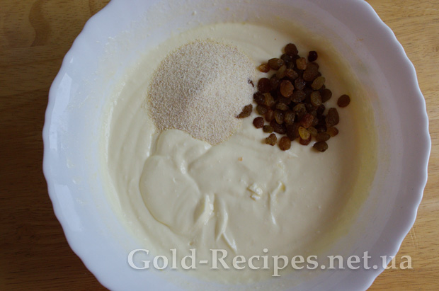 У сирну масу додаємо манку (або крохмаль) та родзинки.