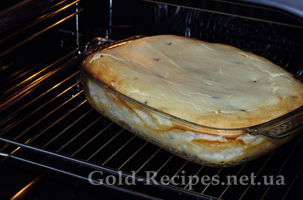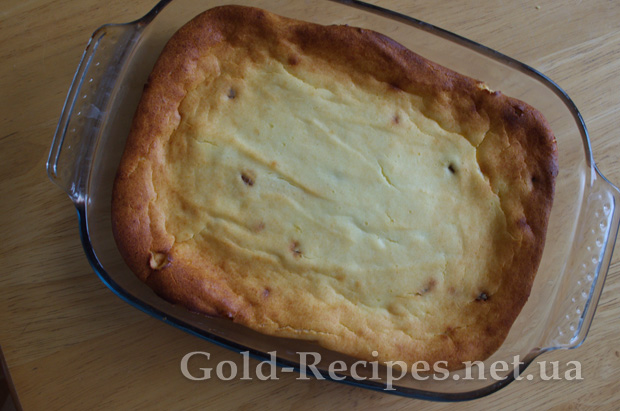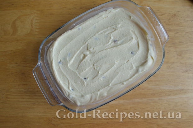 Перекладаємо тісто для сирника у форму, і добре розрівнюємо ложкою. Відправляємо в розігріту до 170-ти градусів духовку, і випікаємо приблизно 45-50 хвилин до золотистої скоринки.