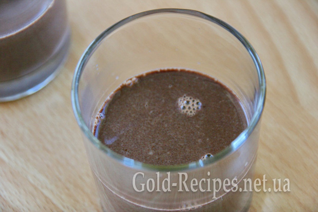 Отриману масу наливаємо в скляні стаканчики – до половини. Можна використовувати й інший посуд, наприклад, креманки. Головне, щоб він був прозорим – тоді буде видно шари желе. Відправляємо стаканчики з шоколадним желе в холодильник – застигати. У мене пішло на це 30-40 хвилин. А самі займемося другим шаром – молочним.