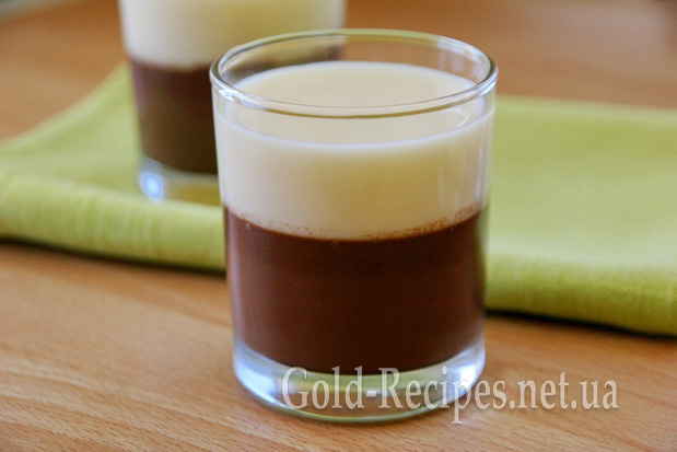 І акуратно наливаємо молоко зі згущеним молоком поверх застиглого шоколадного шару. Знову відправляємо стаканчики з майбутнім желе в холодильник – доти, доки не застигне і білий шар.