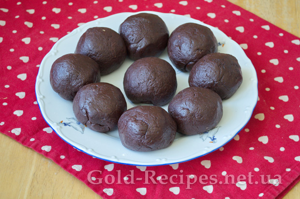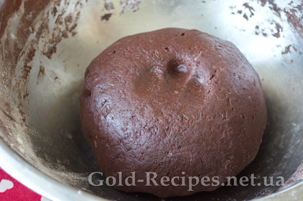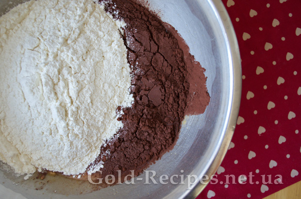 Потім в отриману масу додаємо борошно і какао, щоразу ретельно вимішуючи. Спочатку можна мішати лопаткою або ложкою, потім, коли тісто стане густішим, вимішаємо руками.