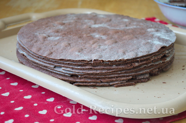 Складемо готові коржі стопкою. Обрізки подрібнимо у блендері або руками до стану дрібної крихти.