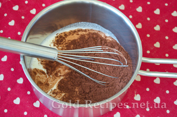 У невеликій каструльці з’єднаємо цукор, какао-порошок та молоко.