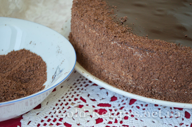 Перед подачею знімаємо кільце і папір, і обсипаємо боки торту крихтою з обрізків коржів.