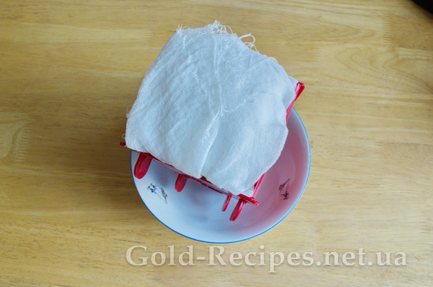 Застеляємо форму злегка вологою марлею так, щоб усі кінці звисали.