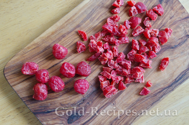 Для цього рецепта я використовувала вишневі цукати (дорого і посередньо за смаком), і вже в процесі зрозуміла, що сміливо можна додавати заморожену вишню, або консервовані вишні у власному соці (попередньо її потрібно розморозити і добре віджати, щоб не було зайвої рідини), також можна використовувати ягоди з вишневого варення без кісточок. Цукати я нарізала на дрібні шматочки.