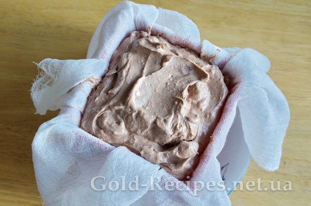 Далі дістаємо сирну паску з холодильника. Спочатку розпечатуємо марлю, щоб звисали кінці.