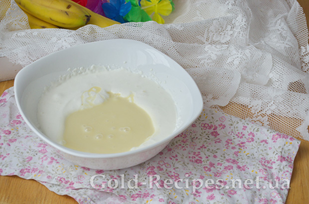 Далі змішуємо в глибокій тарілці сметану та згущене молоко.