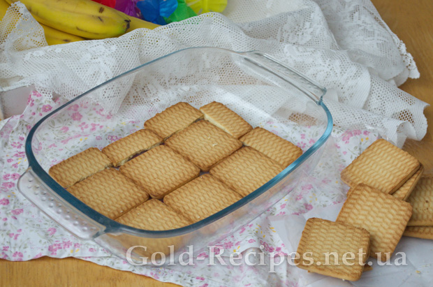 Беремо невелику форму або тарілку, і укладаємо пісочне печиво в один шар. Оскільки я фанатка тортів у формах (навіть медівник збираю у формі?), то і сьогоднішній торт з ювілейного печива теж не став винятком: можна не переживати, що крем потече, або банани повипадають, якщо їх додати забагато.