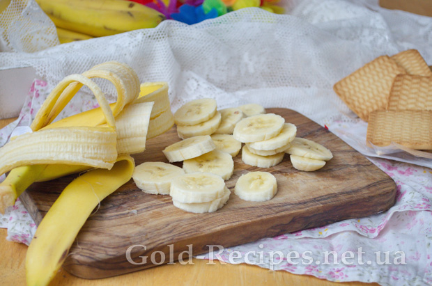 Нарізаємо банани кружечками, і починаємо збирати наш десерт.