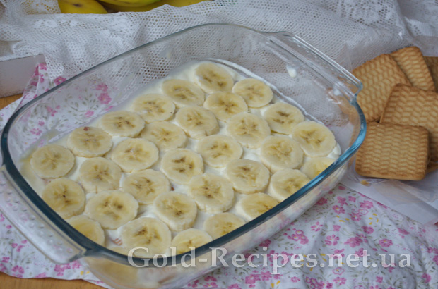 На печиво рівномірно наносимо шар крему зі згущеного молока та сметани, і викладаємо кружечки бананів. Замість бананів можна використовувати будь-які фрукти, які підходять як начинка для торта: консервовані персики, ківі, апельсини, манго.