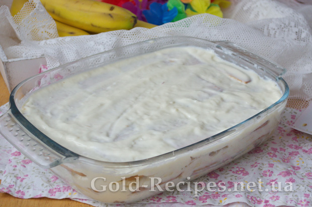 Повторюємо шари з печивом, кремом і бананами кілька разів. У мене вийшло всього три шари.