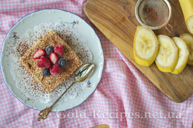 На цьому приготування торта закінчено. Готовий десерт нарізаємо на порційні шматочки, і подаємо з чаєм або кавою. Для подачі я використовувала заморожені ягоди і порошок какао.