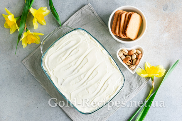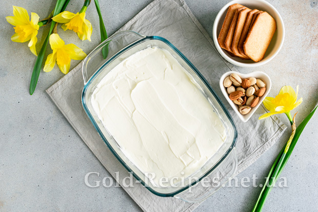 Зверху викладаємо 2-3 столові ложки крему, рівномірно розподіляємо його по всьому периметру форми за допомогою лопатки.