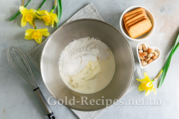 У глибокому посуді змішуємо охолоджений вершковий сир, холодні вершки та цукрову пудру.