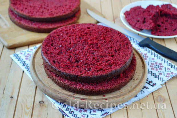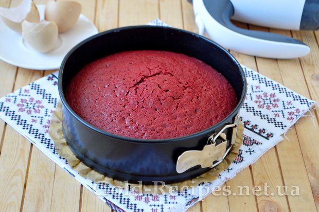 Випікаємо червоний бісквітний корж за 180 градусів приблизно 35-45 хвилин. Готовність бісквіта визначаєте дерев’яною шпажкою.
