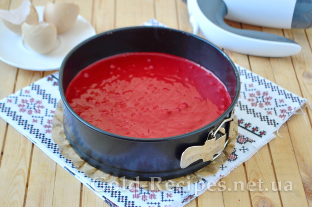 Половину цього незвичайного тіста переливаємо у форму на 20-22 см, застелену по дну пергаментом.