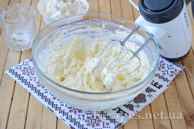 А потім, зменшивши у міксера оберти, починаємо вводити частинами охолоджений вершковий сир. Виходить пишний білосніжний крем.