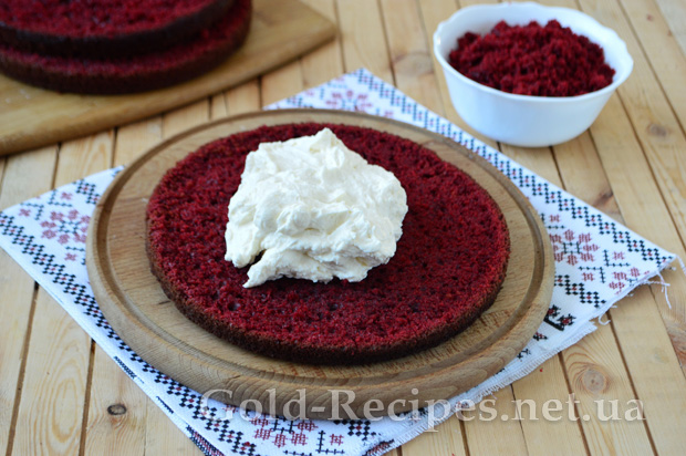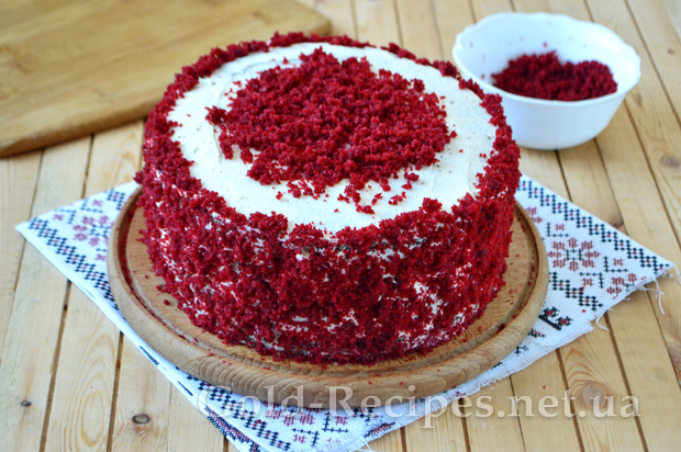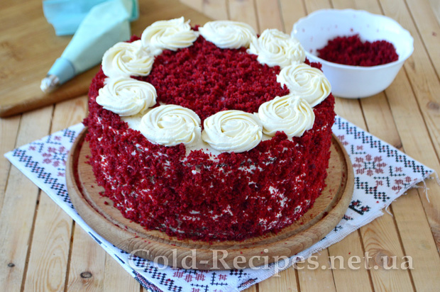Залишками крему змащуєте торт нетовстим шаром зверху і вирівнюєте боки. А потім обсипаєте червоною бісквітною крихтою. Можна обсипати весь торт, надавши йому гарного оксамитового вигляду, а можна по краю верху залишити місце для кремових візерунків.