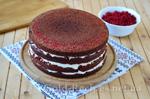 Збираємо всі коржі. Торт Червоний Оксамит виходить досить високим і рівним.
