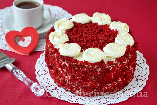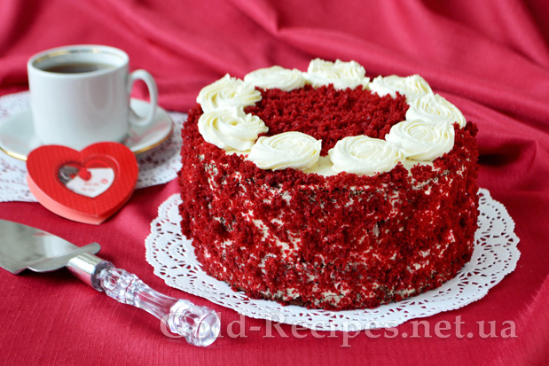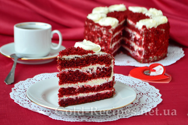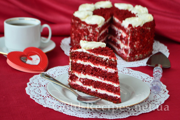 Його насичено червоні коржі мають дуже ефектний вигляд на фоні білосніжного крему, роблячи зовнішній вигляд торта оригінальним і вишуканим.