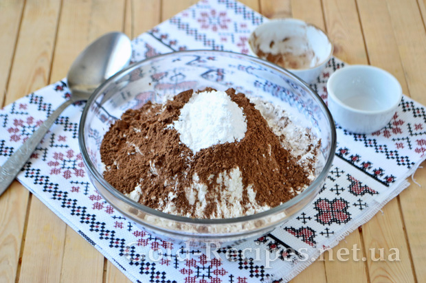 Для початку змішуємо в окремій сухій чашці борошно, розпушувач і порошок какао.