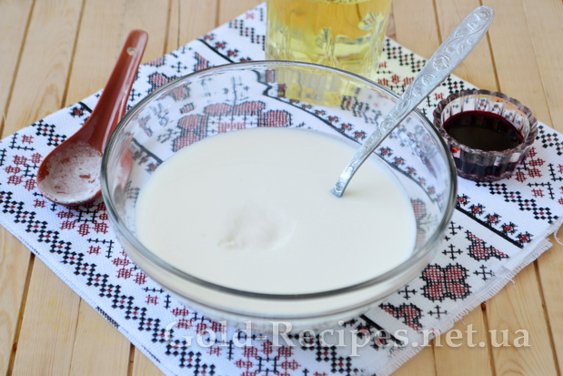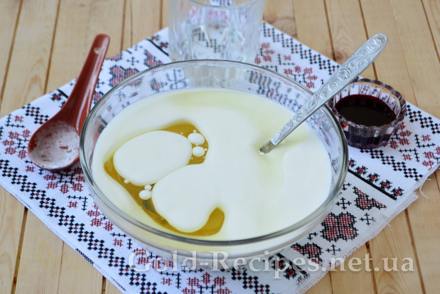 Потім додаємо до кефіру рослинну олію без запаху. Відсутність запаху і будь-якого присмаку в олії – це обов’язкова умова, інакше смак коржів торта буде безповоротно зіпсований.