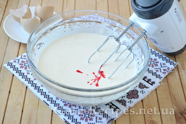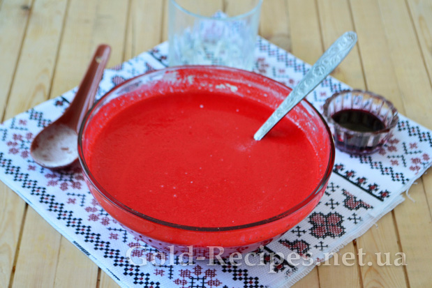 Слідом за олією додаємо в миску харчовий барвник червоного кольору. Якщо використовується гелевий барвник, то його просто додають у масу і перемішують, якщо порошковий, як у моєму варіанті, то барвник спочатку розводять у малій кількості води, а потім уже вводять у тісто.