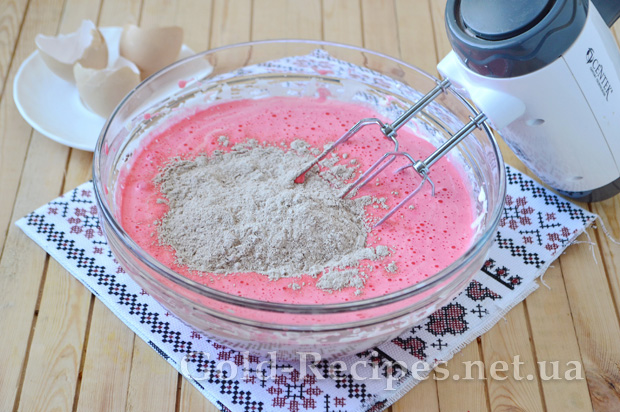 Потім вводите частину борошняної суміші і знову перемішуєте масу міксером на низьких обертах.
