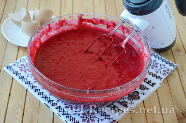 Потім повторюємо. Вводимо другу частину червоної маси, перемішуємо, додаємо залишки борошняної суміші, перемішуємо і отримуємо густувате тісто насиченого темно-червоного кольору.
