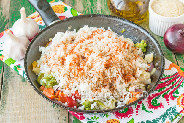 Приправимо страву червоним меленим перцем, додамо соєвий соус. Перемішаємо, прогріємо наш смажений рис з замороженими овочами протягом хвилини і вимкнемо вогонь.