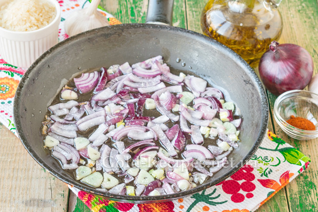 Розігріємо на сковороді невелику кількість оливкової олії. Перекладемо в неї порізану цибулю та часник і, помішуючи, обсмажимо їх протягом 2-3 хвилин.