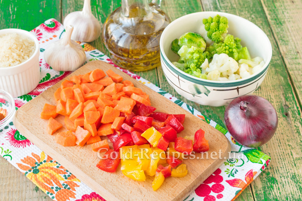 Романеско, суцвіття цвітної та брюссельської капусти розріжемо на кілька частин. За бажанням рис з овочами можна доповнити стручковою квасолею або кукурудзою.