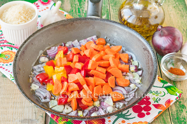 Додамо моркву та солодкий перець до обсмажених овочів. Перемішаємо і продовжимо готувати овочі разом.
