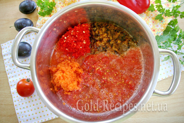 Підготовлені інгредієнти: сливу, гіркий і болгарський перці, моркву і помідори пропускаємо через м’ясорубку.