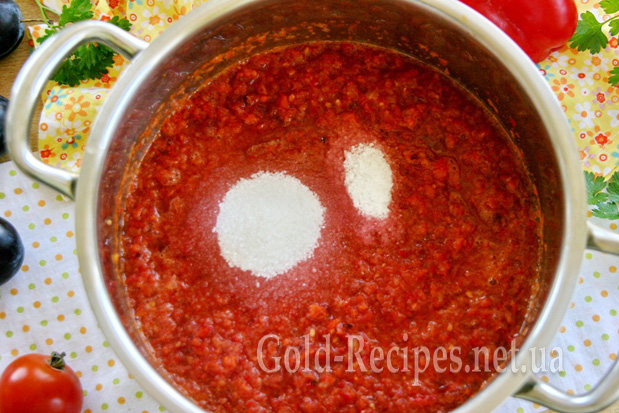 Кладемо сіль, цукор і перемішуємо. На такому ж маленькому вогні варимо ще 30 хвилин.