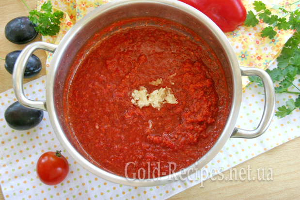 Кладемо в аджику часник, пропущений через часникодавку, перемішуємо і пробуємо на сіль: можливо, потрібно трохи досолити, щоб аджика зі сливами виходила збалансованою за смаком.