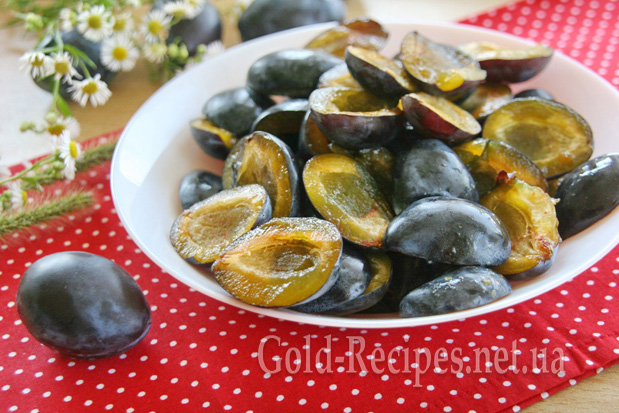 Гострим ножем сливи розрізаємо по борозенці навпіл і видаляємо кісточку.