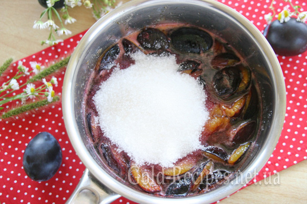 Потім у каструлю до слив додаємо ще 250 г цукру, перемішуємо і так само варимо: доводимо до кипіння, потім варимо 5 хвилин на мінімальному вогні.