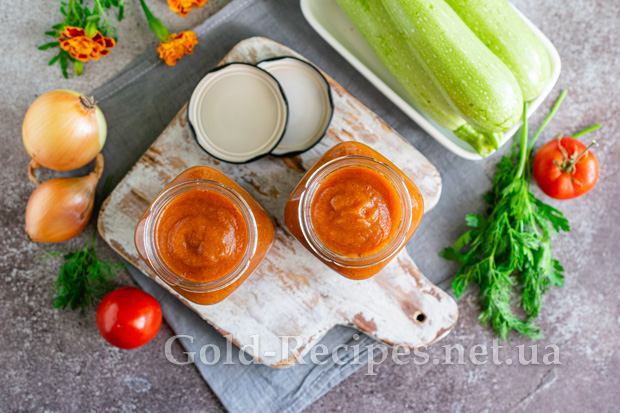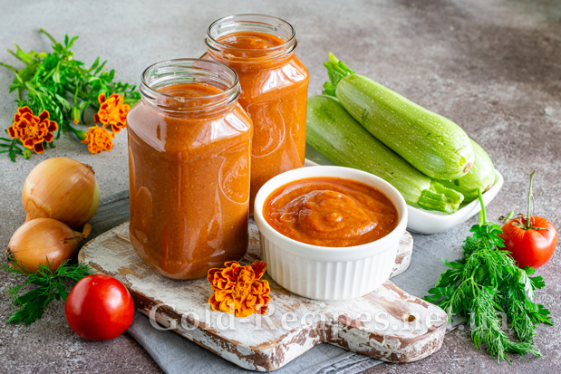 Готовий ароматний кетчуп з кабачків подаємо до курки, м’ясних страв або ковбасних виробів.