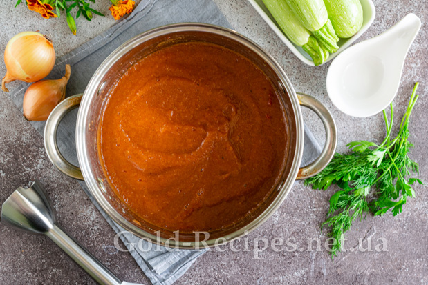 Акуратно знімаємо кетчуп із кабачків із вогню, перебиваємо його занурювальним блендером до однорідної консистенції. За бажанням цей крок можна пропустити.