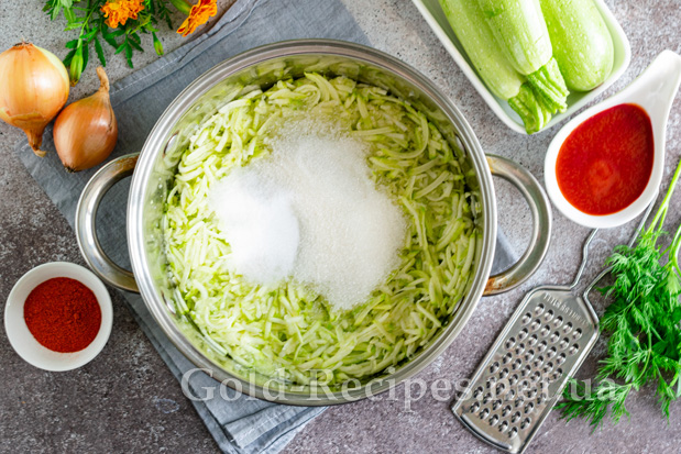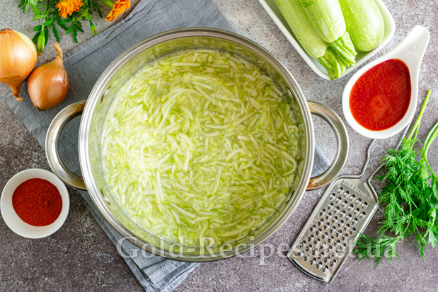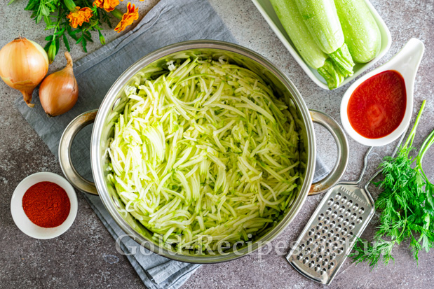 Кабачки миємо, обрізаємо хвостики. Зрілі овочі заздалегідь очищаємо від шкірки. Подрібнюємо кабачки на терці з великим полотном. Перекладаємо овочі в глибоку каструлю із товстим дном, не віджимаючи їх від соку.