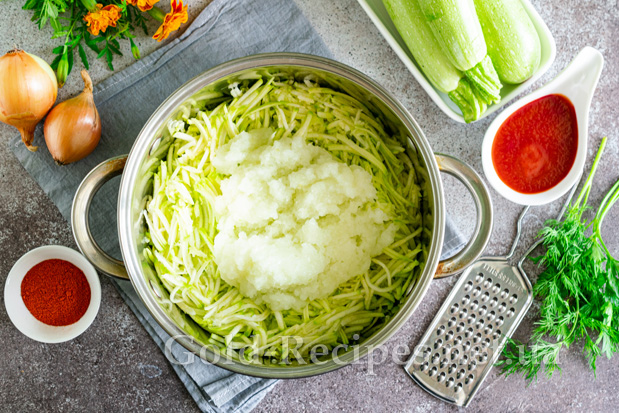 Цибулю очищаємо від лушпиння, нарізаємо на великі шматочки. Подрібнюємо овочі за допомогою блендера або м’ясорубки з дрібною решіткою. Додаємо подрібнену цибулю разом із соком до кабачків.
