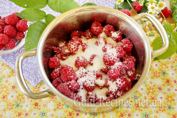 Викладаємо тонким шаром малину в миску або широку каструлю, засипаємо частиною цукру.